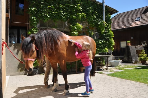 Tiere müssen gepflegt werden, damit sie nicht verwahrlosen. Edi geniesst das Bürsten immer sehr. Das Kind lernt dabei, für andere zu sorgen. So erweitert es seine soziale Kompetenz.